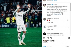 劳尔-阿森西奥社媒晒出谢场的照片,并写道:“我们努力了,但事与愿违。皇马球迷,感谢你们的支持以及对逆转的信念。我们会继续战斗,,争取本赛季为你们带来更多快乐。”